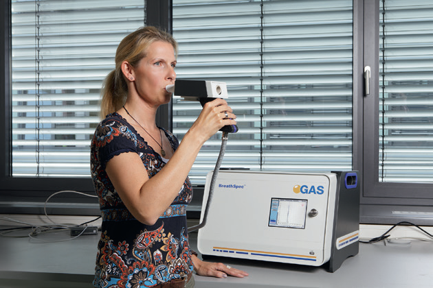 远程取样—呼吸采样: 实际呼吸采样只需一次呼气。待测者呼气进入采样器,在后半部分,将5mL呼气取样到普通的注射器中。拉动注射器的活塞可以由待测者自己完成,或者由护士来帮助完成。如果采样失败,可以立即重复。